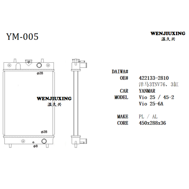 Wenzhou Jiu Xin Business Trading CO.,LTD. was established in June, 2014, is situated one of beautiful cities Wenzhou city is the auto spare parts center. The company persisted throughout take “the technical innovation, the cooperation altogether wins, the good faith highly effective, the service first-class” as serves idea, by high and new technology and brand making enterprise.We have the specialized team and the mature technology, resolves specialized company which into the domestic same profession is second to none.Company's specialized production passenger vehicle, the forklift,transport mixe, the heavy truck and the project mechanical radiator and charge air cooler: